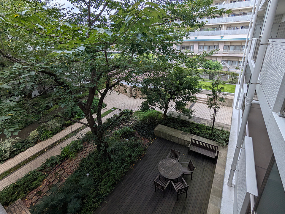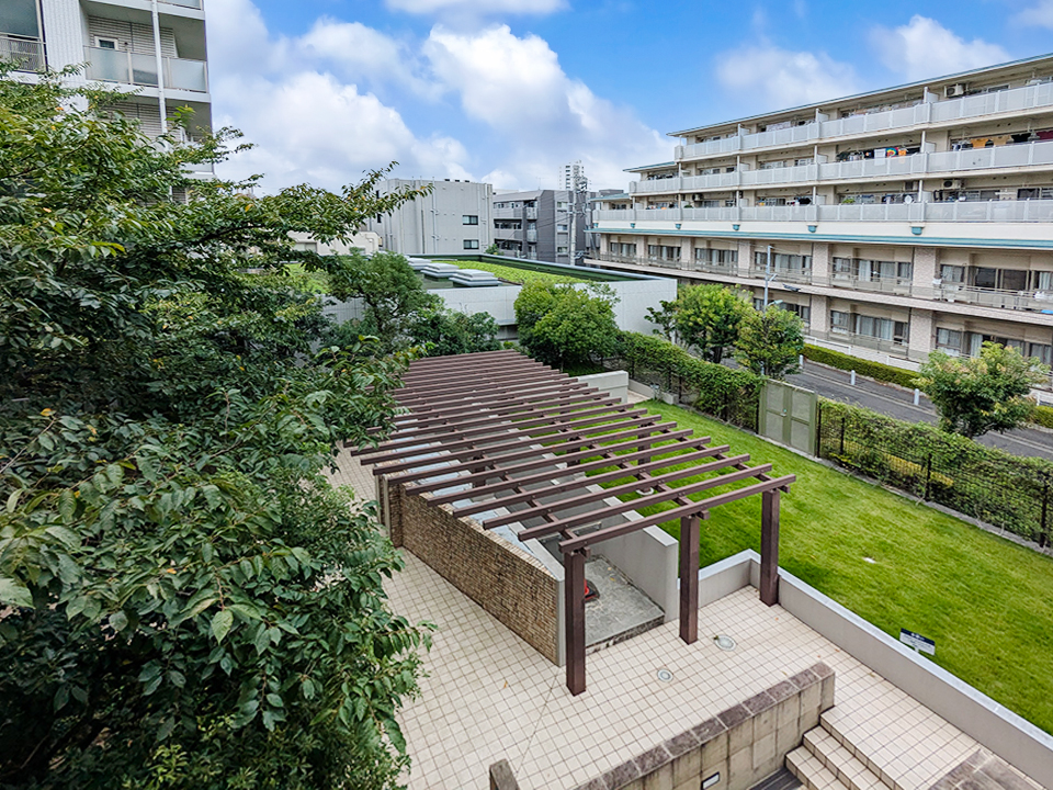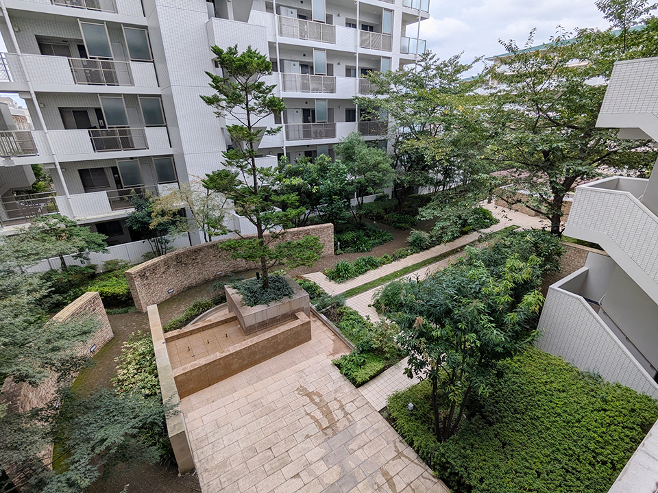 マンション全体は南・西・東の3棟がコの字型につながり、中央には広い共用庭があります。