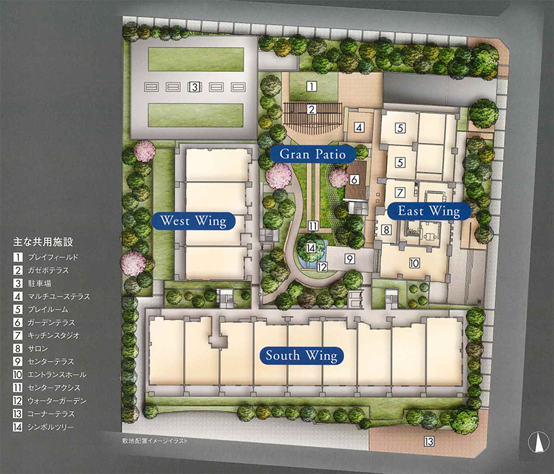 ■北側には芝生のプレイフィールド「Gran Patio」やウッドデッキのガーデンテラス