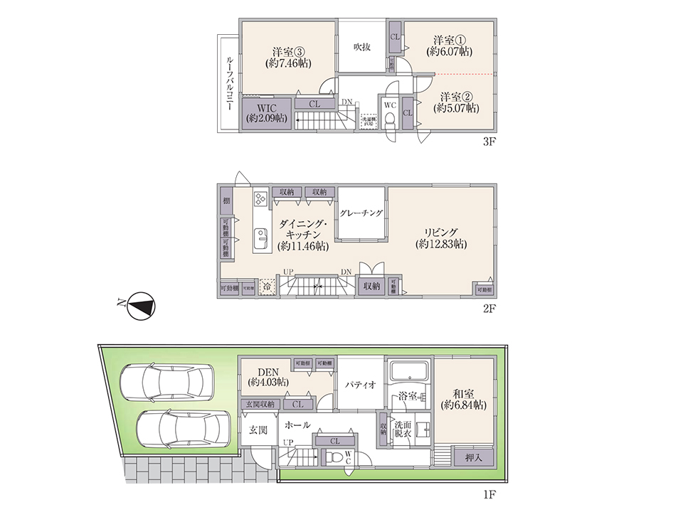 広々とした玄関ホール、3LDK+DEN(書斎)の構成。